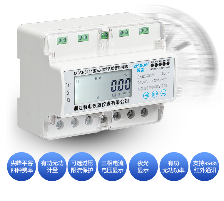 三相導軌式多費率電能表DTSF6111-7系我公司采用微電子技術計量電能,采用進口集成電路,應用數字采樣處理技術及SMT工藝等先進技術研制開發的電子式電能表。能直測量電能計量中正向有功電能,7LCD顯示器顯示有功用電量,具有可靠性好、體積小、重量輕、外表美觀、工藝先進、35mmDIN標準導軌式安裝等特點:并具有良好的抗電磁干擾、低自耗節電、精度高、高過載、穩定性強、防竊電、壽命長,液晶屏幕上可顯示當前總電量,無功電量,尖峰平谷的電量,電流,電壓,功率,功率因素,頻率,支持RS485 DL/645--2007或MODBUS通訊規約。