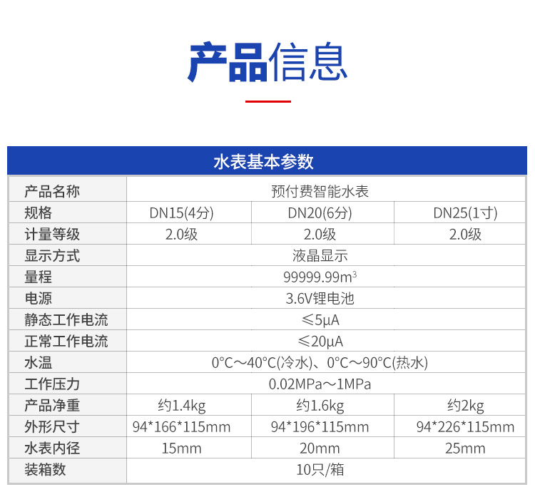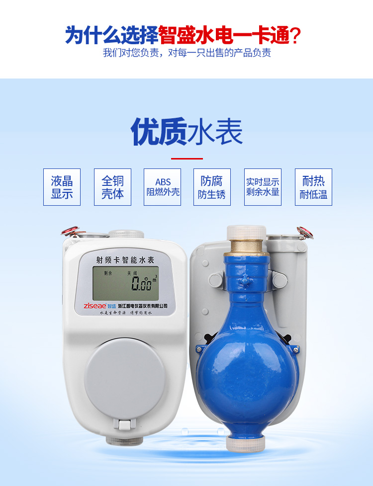 1、概述預付費水表是以旋翼式水表為基表,由干簧管取信裝置、低功耗電控閥門、微電腦控制系統、射頻卡信息系統集合而成的智能水表。該產品改變了傳統的用水收費方 式,由“先用水后交費”變為“先交費后用水”,   每次售水收款都有記錄,解決了“收費難、賬目亂”這兩個水費管理工作中的難題。有遠傳抄表功能的預 付費水表還可實時統計用水數量,為水費結算提供依據。產品符合國家標準GB/T778-2007《封閉滿管道中水流量的測量、飲用冷水水表和熱水水表》的全部技術要求。